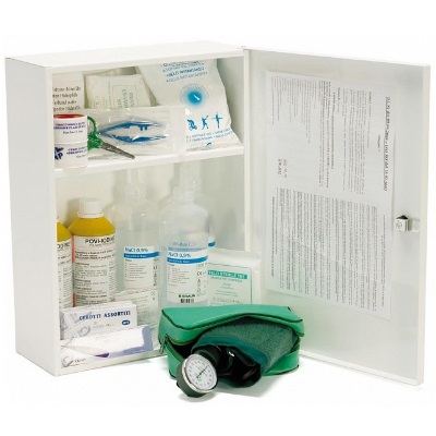 Armadietto in metallo verniciato con polvere epossidica, 1 ripiano, 2 vani, con serratura con chiave. Contenuto conforme al D.Lgs. n. 81/2008 – All. 1 D.M. 388/2003 Gruppi AB per aziende o unità produttive con tre o più lavoratori.